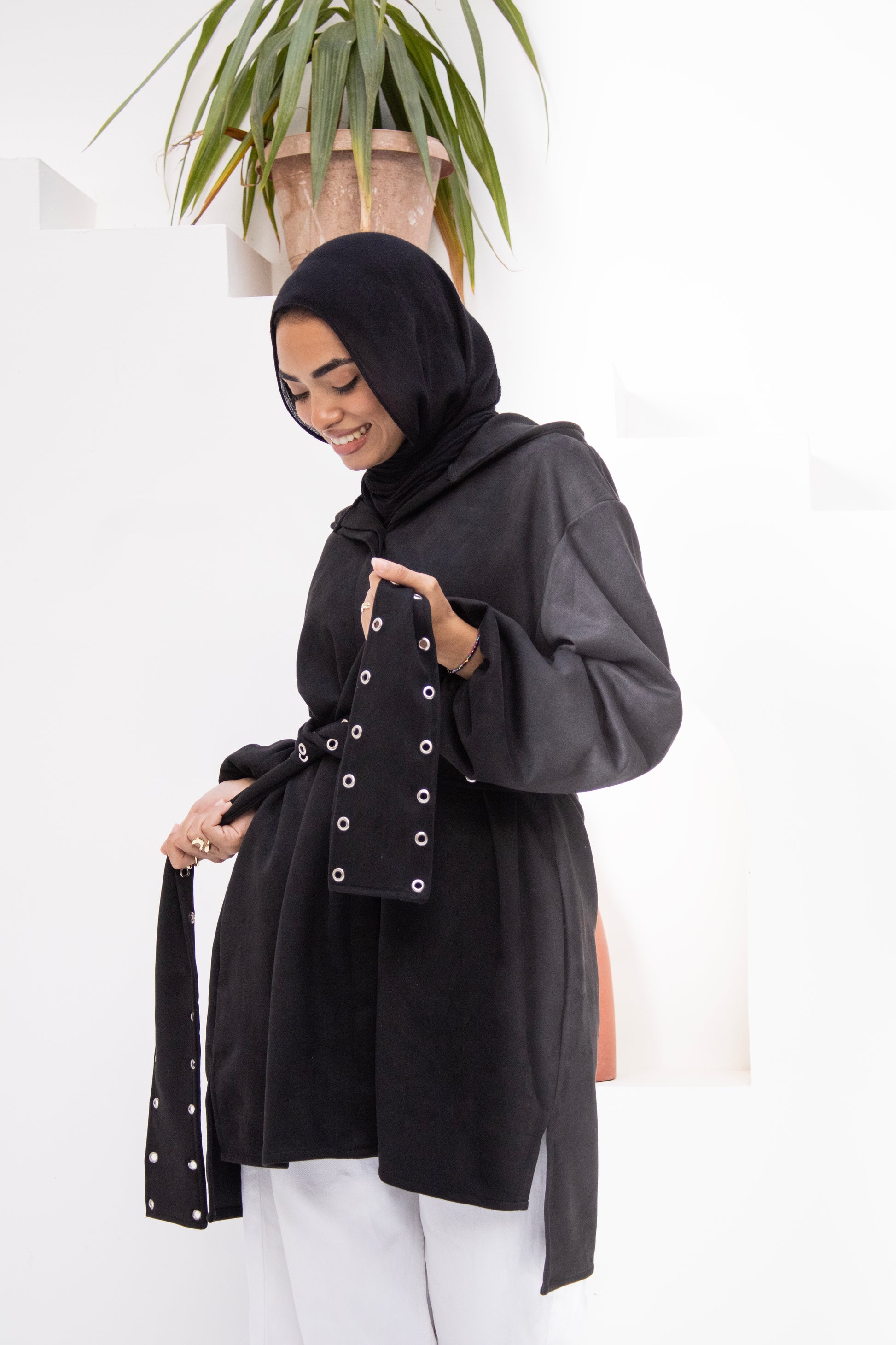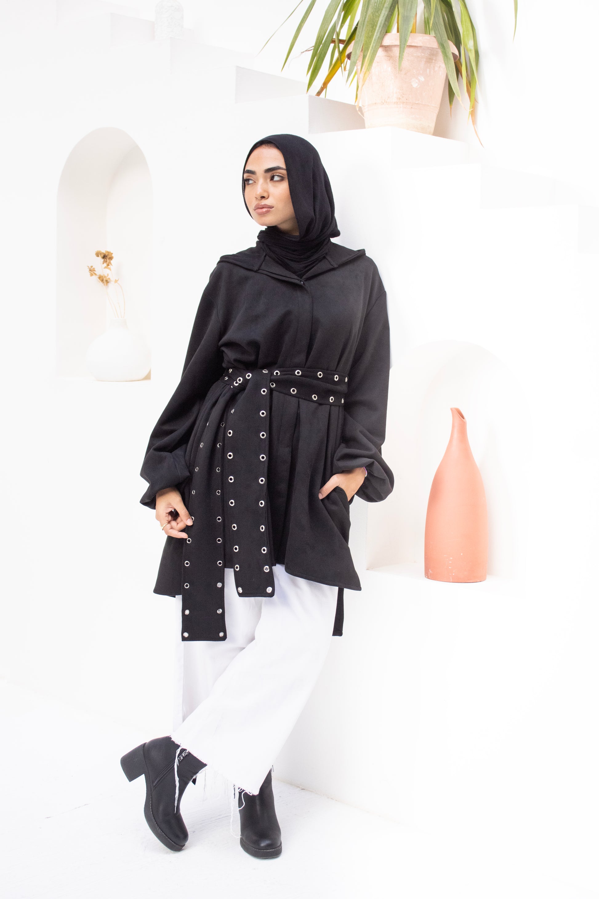 Bring a modern edge to your everyday wardrobe with our Belted Hooded Jacket in a rich olive green. This versatile piece features a relaxed, slightly oversized fit with a stylish high-low hemline, roomy sleeves, and a structured hood for a casual yet polished look. The standout feature is the adjustable grommet belt, designed to cinch the waist and create a flattering, defined silhouette. Layer it effortlessly over neutral-toned basics for an elevated, urban-chic vibe. Perfect for transitional weather, casual outings, or stylish layering.