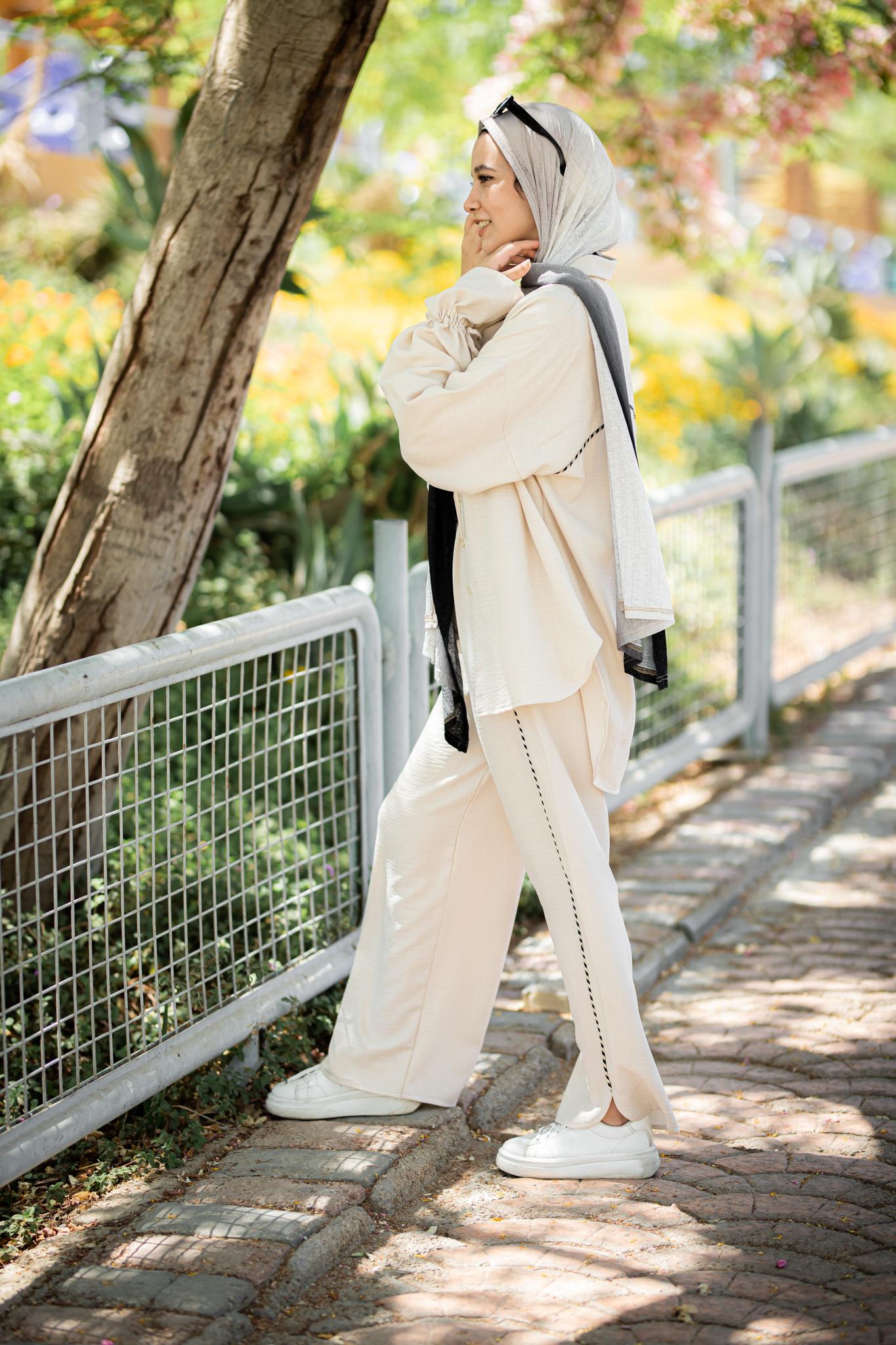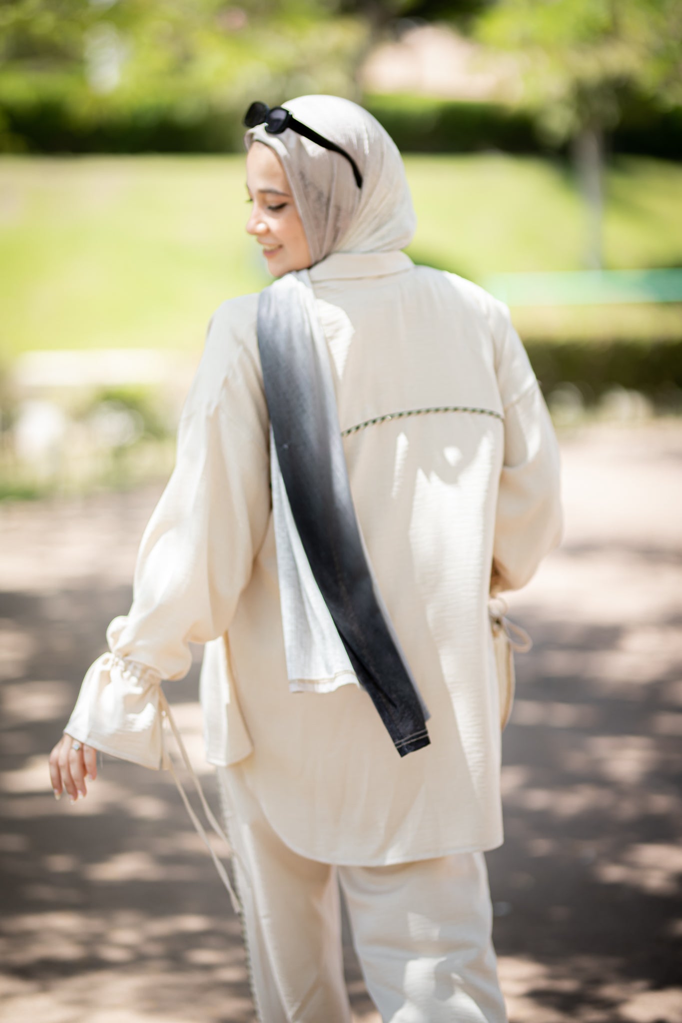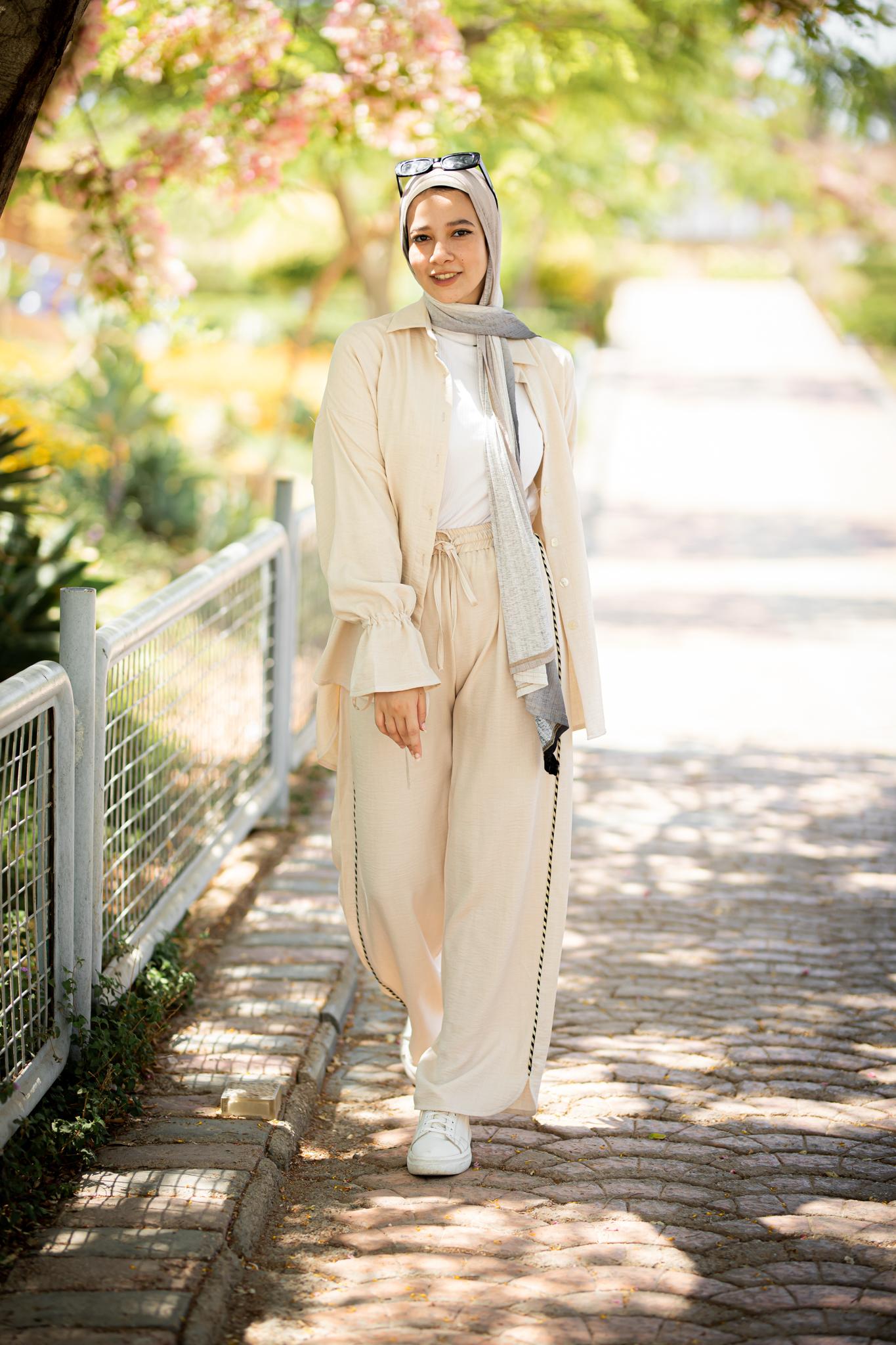 This effortlessly chic daytime look combines comfort and elegance with a soft, monochromatic palette. The outfit features a lightweight, beige button-down shirt with flared cuffs, layered over a white inner top for a clean and modest silhouette. Matching wide-leg pants with a drawstring waist and subtle contrast piping add structure while maintaining a breezy, relaxed fit. this look is perfect for casual strolls, weekend outings, or travel-ready fashion that doesn’t compromise on style.