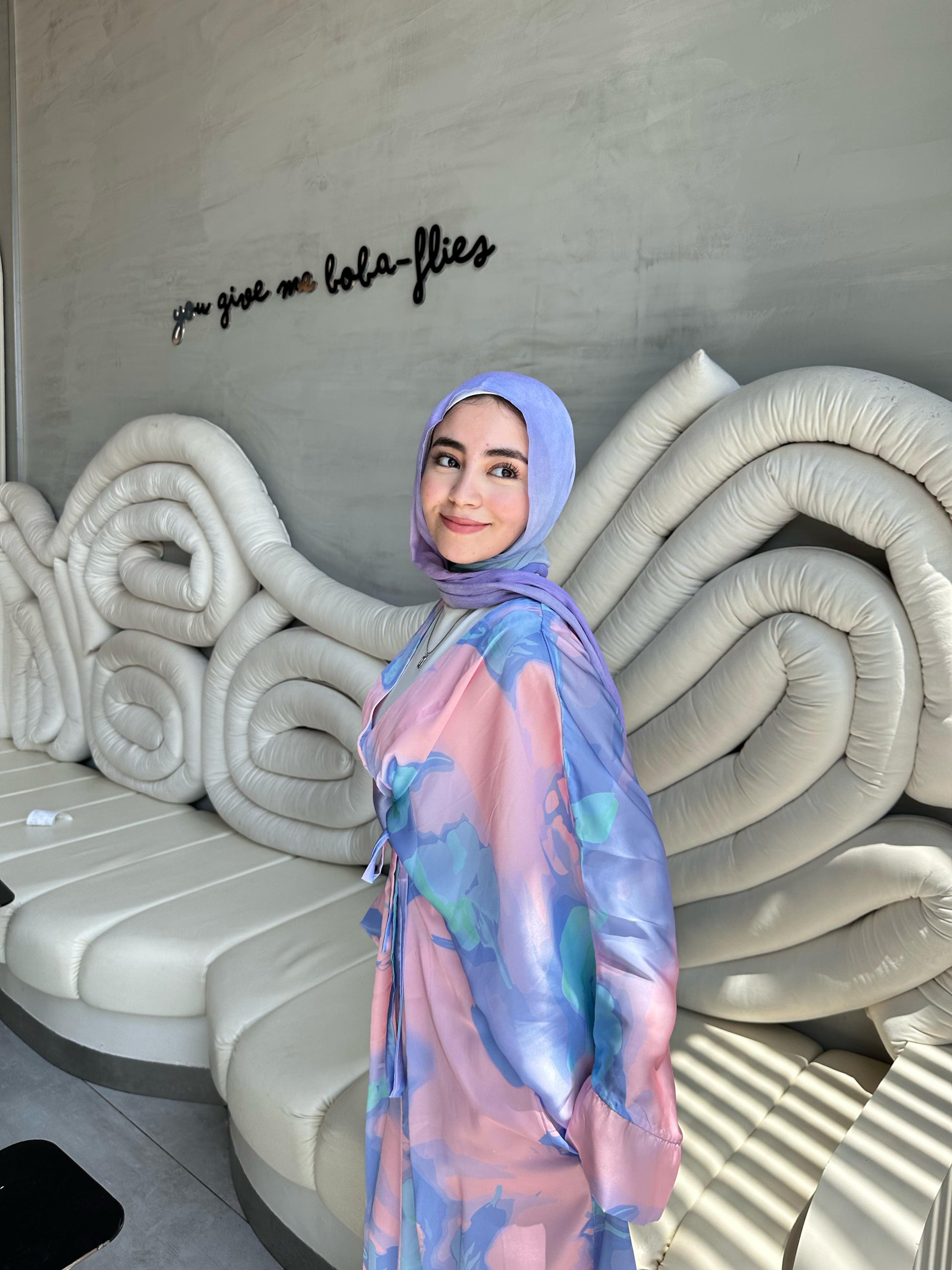 ‏Turn heads with our Luna Watercolor Satin Kimono Dress, where elegance meets artistry. Crafted from luxuriously smooth satin, this full-length dress features a dreamy watercolor print in soft pastel hues of blue, lilac, blush, and cream-perfect for both daytime sophistication and evening glam.