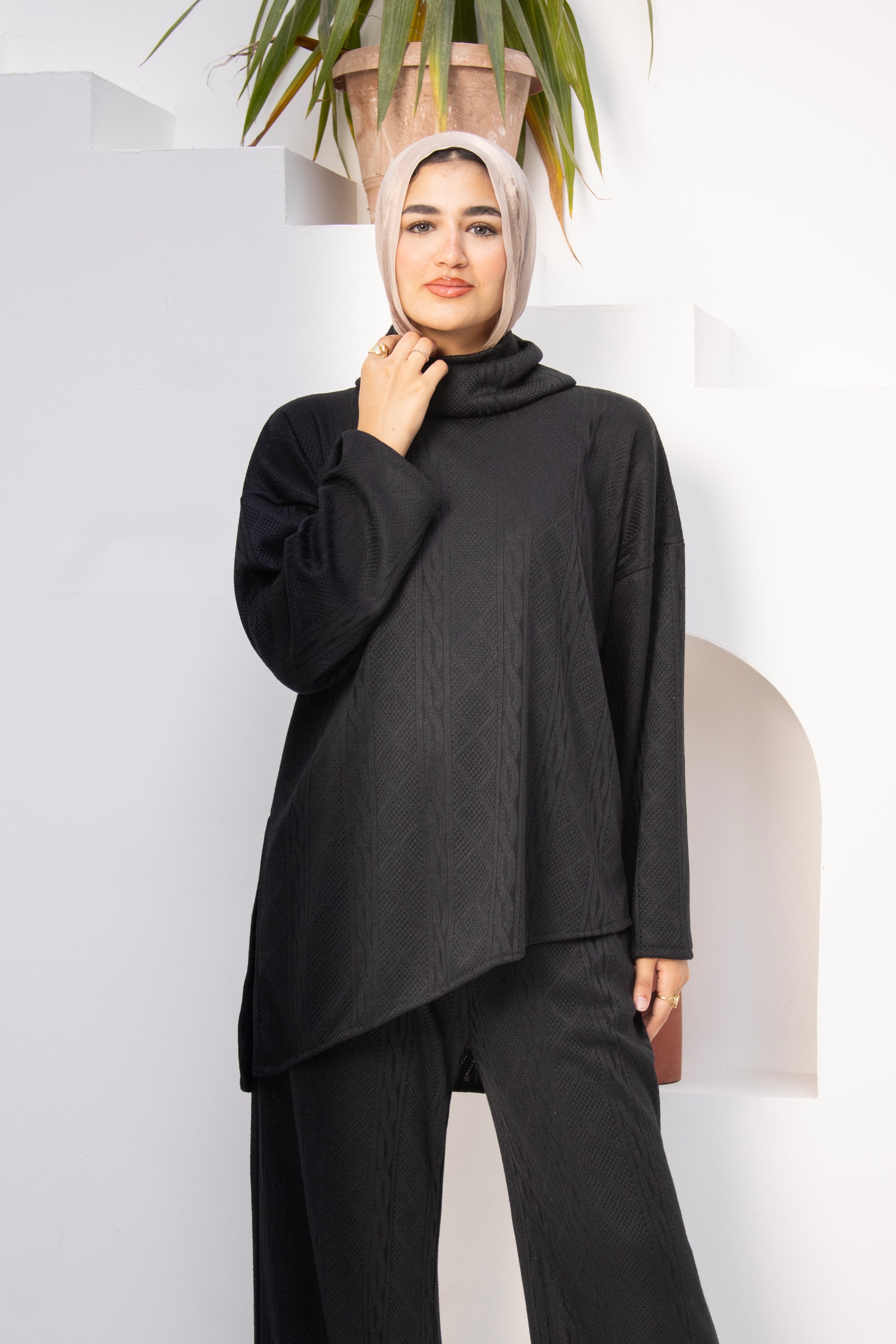 Elevate your everyday style with our Textured Knit Co-Ord Set, a perfect blend of comfort and elegance. This two-piece ensemble features a relaxed-fit tunic with a cozy cowl neckline and matching wide-leg pants, both crafted from a soft, subtly patterned knit fabric. Designed with side pockets for added functionality, the set offers a sophisticated, effortless look ideal for casual outings or cozy days indoors.